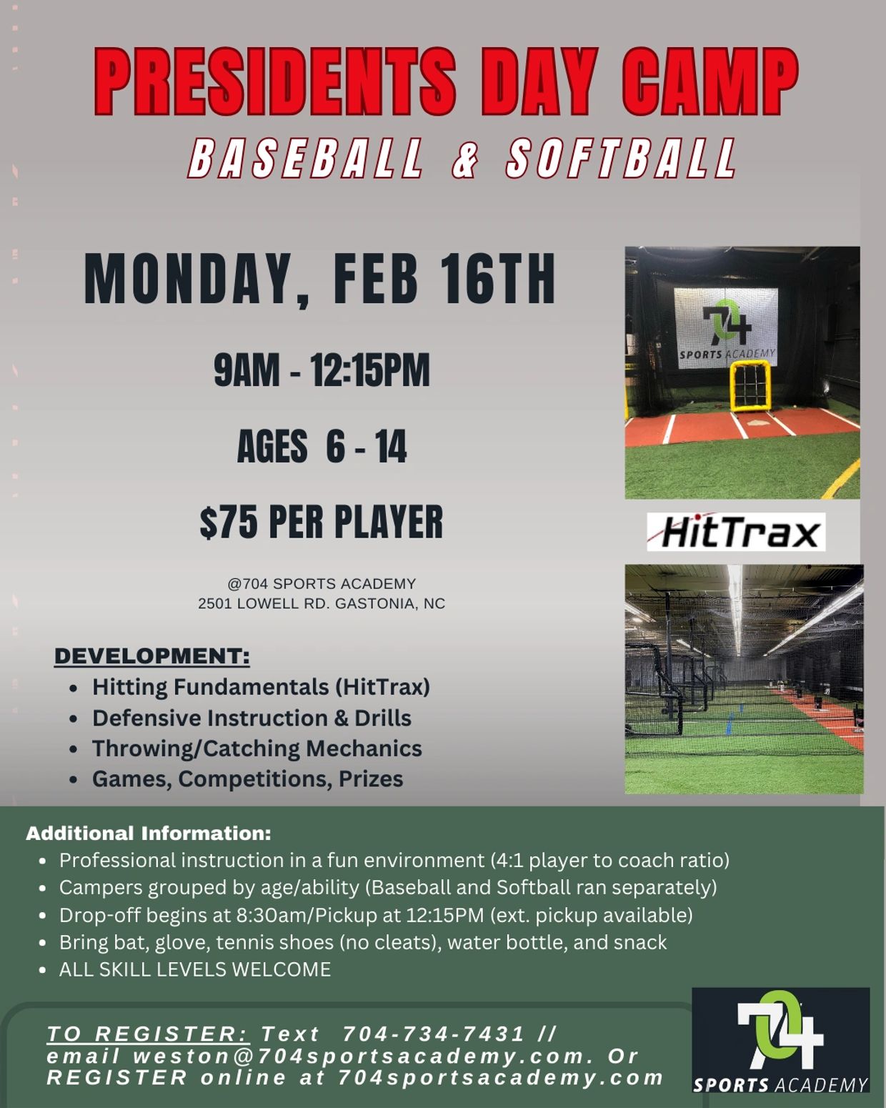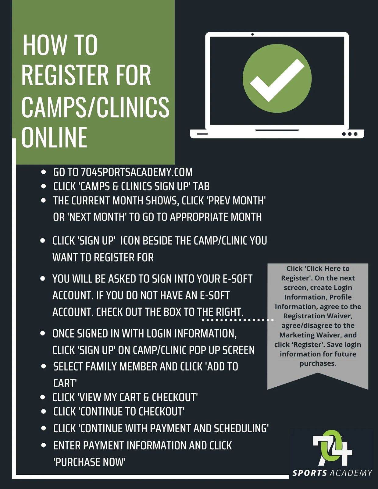 To sign up, create an account with us. Once you have created your account, login, and on your homepage select 'sign up for camps/class'. Click the desired camp/class month, select the camp/class and then register. If you need additional help, please refer to the infographic at the bottom of the page or call 704-734-7431 or email weston@704sportsacademy.com.